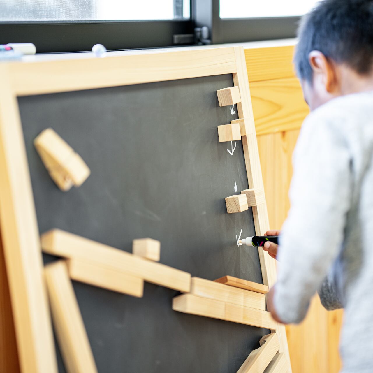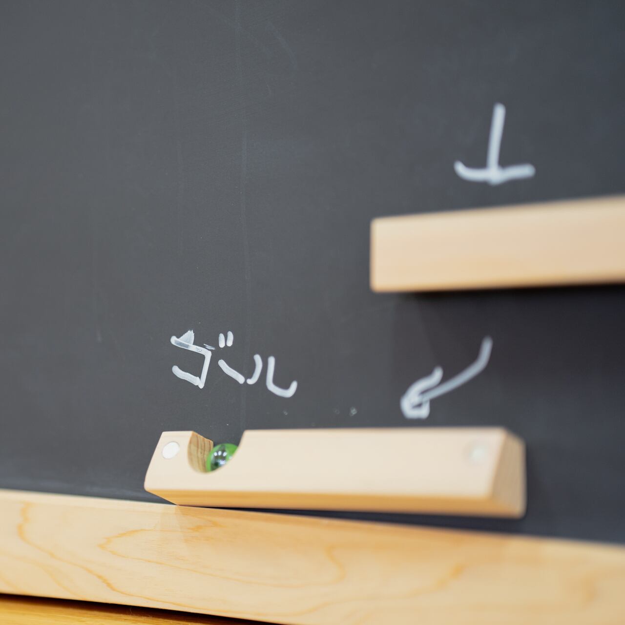 木のレールで球を転がすコースを作ったり、お絵描きしたり、遊び方は自由自在。